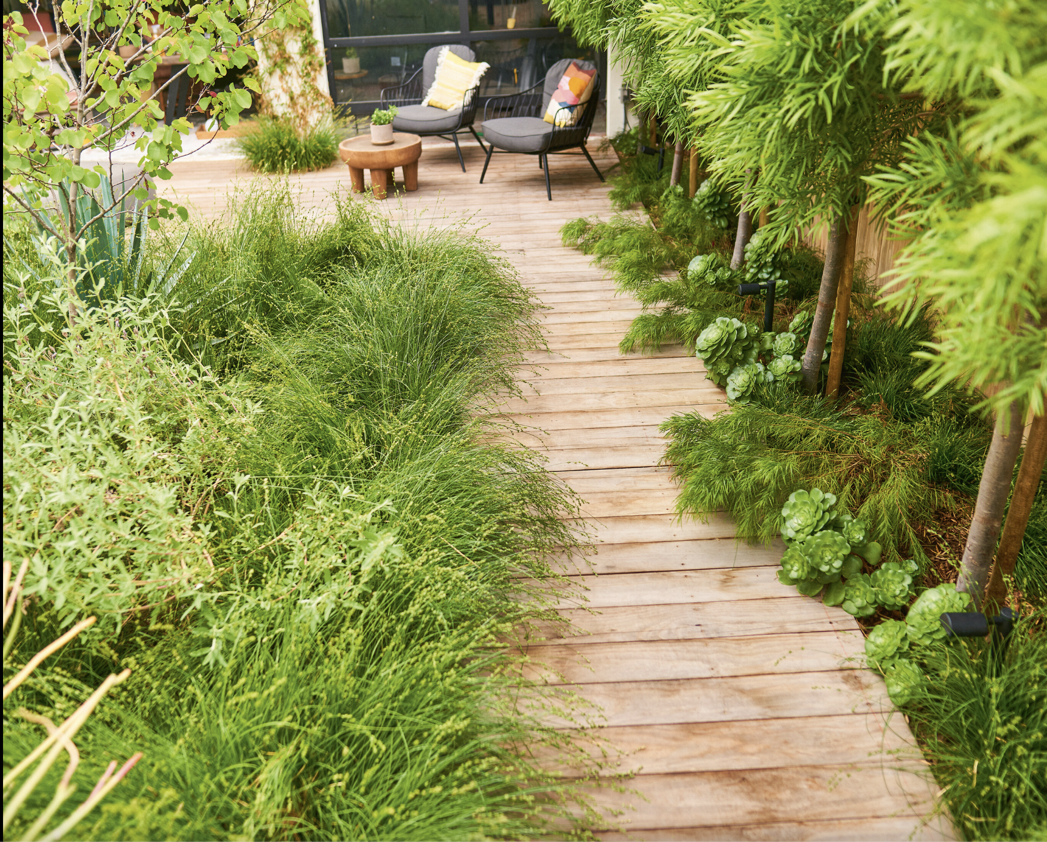 A wooden boardwalk winds through lush greenery in a garden. The path leads to a small seating area with two chairs and a round wooden table. Various plants, including tall grasses and leafy shrubs, border the walkway, creating a natural, accessible pathway. In the background, a glimpse of a building with large windows can be seen, suggesting this is part of a residential garden design.
