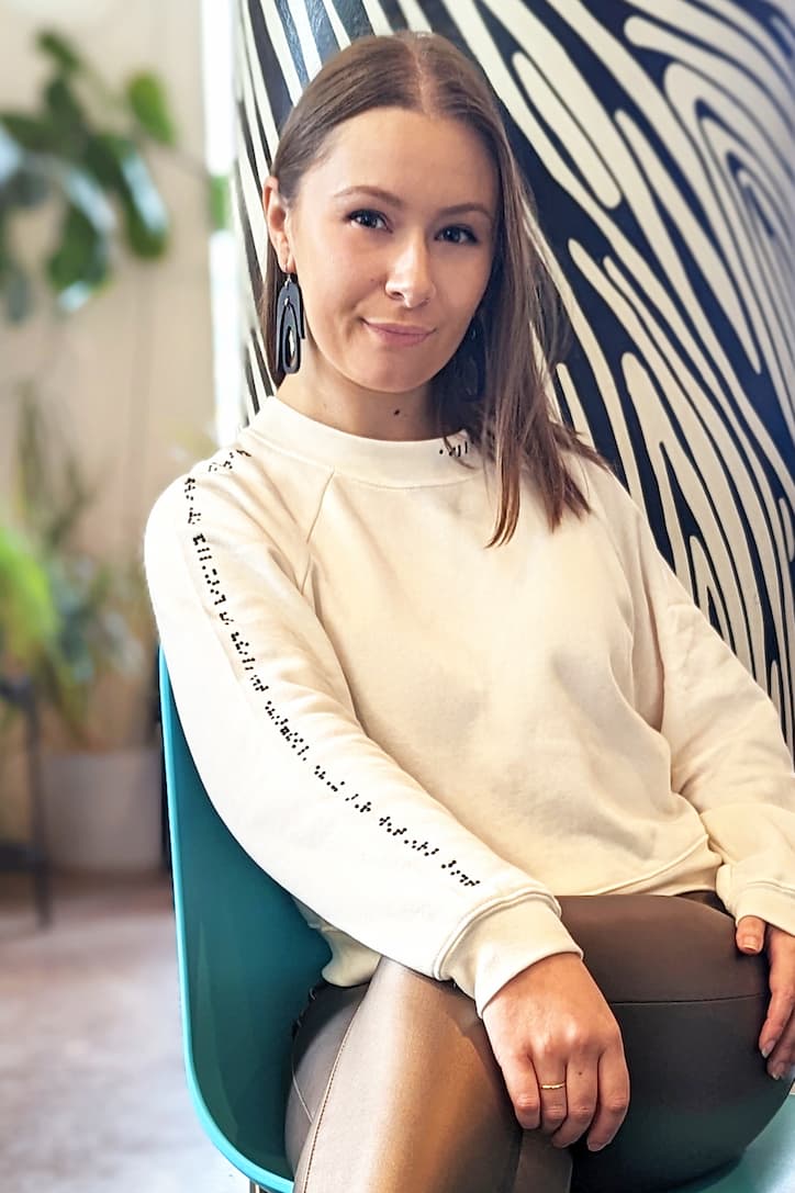 The design process at Aille is called “co-design” and a diverse team of sighted and non sighted individuals (braille readers, fashion stylists, and disability advocates) is creating inclusive clothing, reducing disability related stigma, and creating awareness around the importance of disability. Their clothing consists of motivational and custom messages in braille beadwork. Even though inclusivity is the focus of the brand, the clothing is accessible and easy to wear and maintain, especially for disabled individuals. Aille products do not require ironing, are machine washable, and designed for walkability. The brand that started with a prototype shirt has extended its offerings to blazers, dresses, sweaters, pants and more in the three years of its existence,