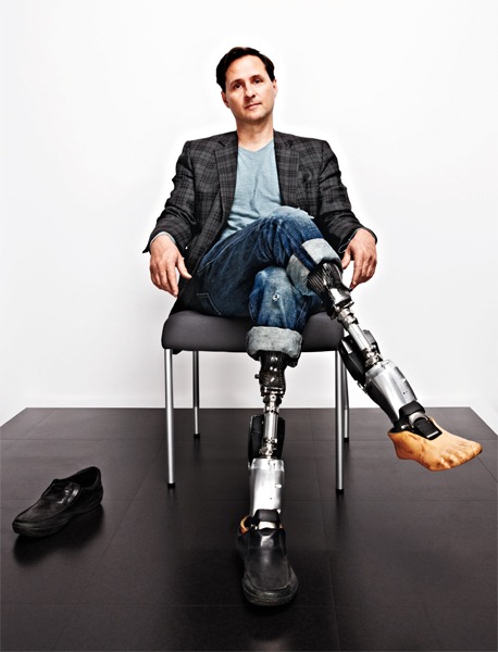 Hugh Herr, head of the Biomechatronics Group of M.I.T. Media Labs, wears his own creation: The BiOM T2 battery-powered ankle-foot prosthesis. The device merges advanced electronics and biomechanics to mimic lifelike motion, allowing the user a more natural gait. Since 2010, the world’s first bionic foot-and-calf system has been used by more than 900 patients worldwide, including over 400 war veterans.