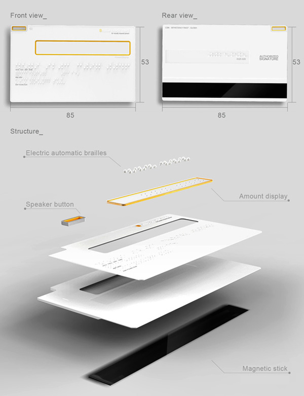 Speaking of Braille cards, here is a credit card concept design that shows the amount that has been paid in Braille on the credit card. The designer of this card thinks that having a Braille credit card can provide benefits to visually impaired users in a couple of ways in that with a regular credit card, they have to depend on the person behind the counter telling them what the actual amount to be charged is. The amount that they tell the user may be incorrect. The braille credit card, however, embosses the amount charged on the card so that the user could feel it. Also, the credit card has a built in speaker that can speak out the amount charged at the push of a button.