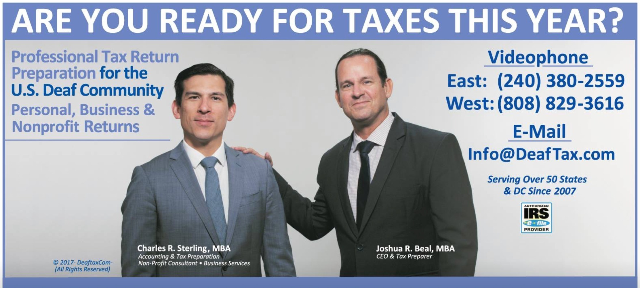 It’s not time to file taxes yet but in a couple of months, starting January, each and every one of us (especially in the US) would be scrambling around to get their taxes filed. For deaf people, who need help filing their taxes, and would prefer interacting with tax experts in ASL, they would possibly want to consider deaftax.com. Deaftax.com offers a group of experienced tax professionals who specialize in consultation and tax preparation for individuals, married couples, businesses, not for profits, and corporations. Deaftax.com staff members are deaf and communicate in ASL, thus averting any possible errors and mistakes.