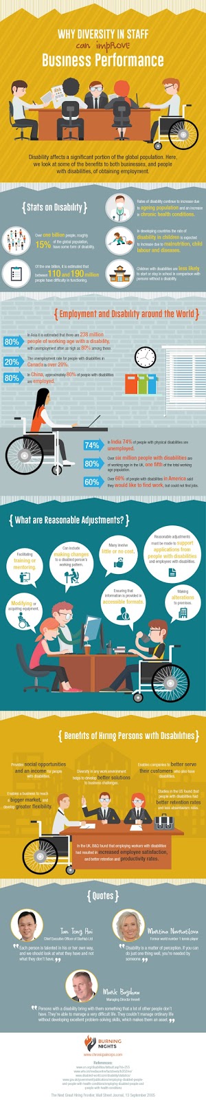 This infographic from Burning Nights aims to increase awareness on the difficulties that persons with disabilities face in gaining employment, while also focusing on some of the benefits that both employers and employees can attain from choosing to employ persons with disabilities. (click here to open infographic in a bigger window, and then click again)