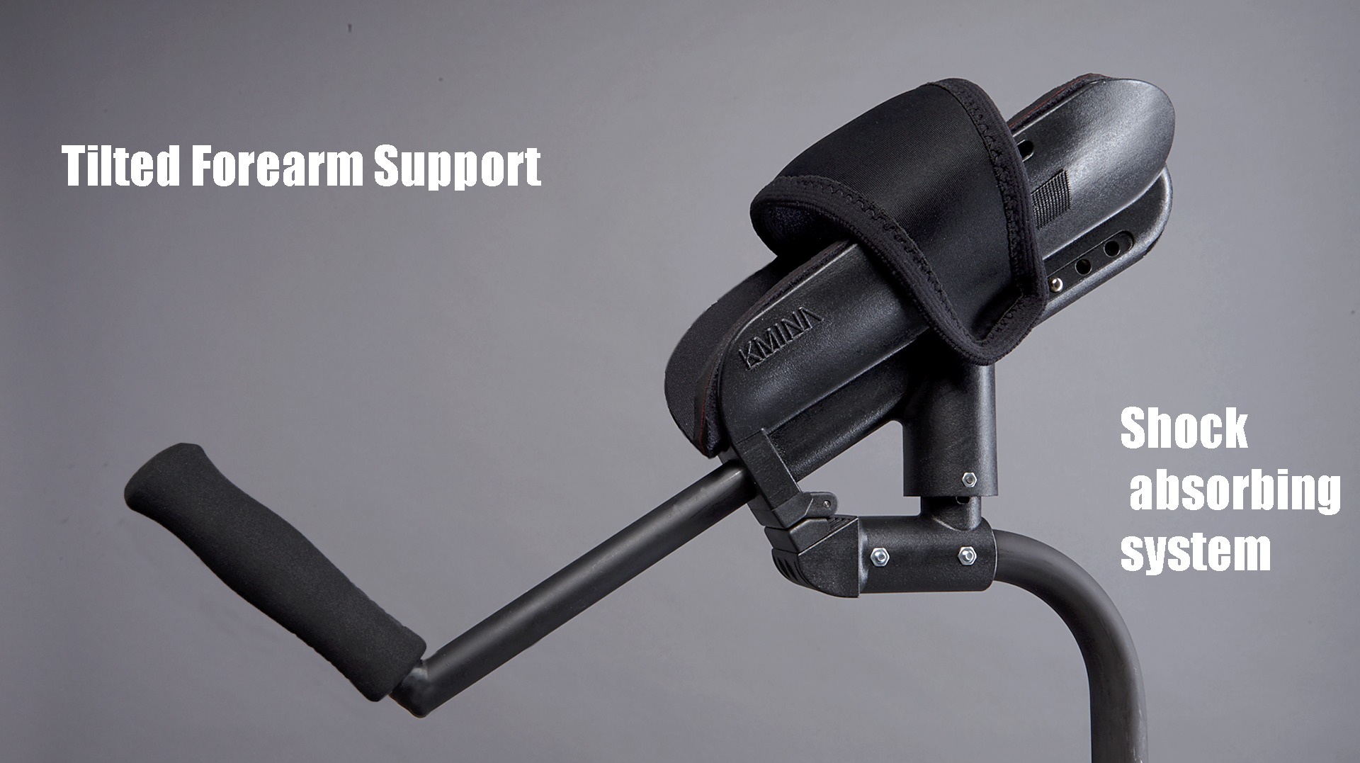 Aware of the damage caused by traditional crutches and given the clear need for improvement in this field, KMINA has patented a totally revolutionary crutch. It includes a shock absorbing system and a tilted forearm support that properly distributes the weight of the body. Thus, the effort is evenly shared, and both the hand and the wrist reduce the burden by 80%.