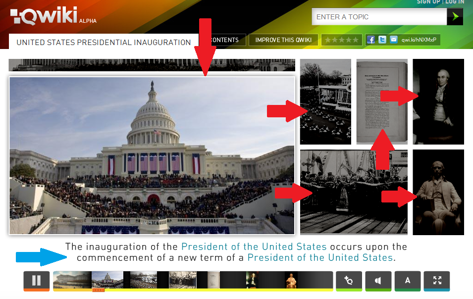 Selecting one starts playing the contents of the Qwiki. As you can see in the next screen, it shows not only pictures related to the topic (red arrows; which are a part of that Qwiki), but also the text that is being read aloud (blue arrow).