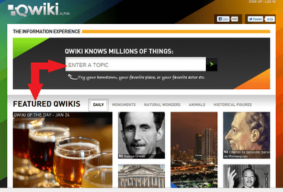 This is the main Qwiki website. Notice that it has a “Enter a Topic” text box that lets you search for topics, and a “Featured Qwikis” section.