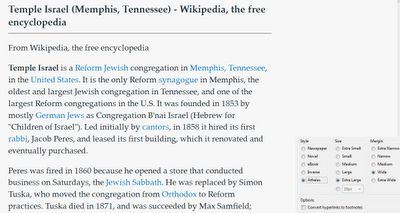 Notice that the only thing left on this page is the main text from the article, which is displayed in one column. The menu at the bottom lets the user choose the style, font size and margin. The screen shot above is the “newspaper” mode. The text can be enlarged up to 40px. The margins can be set from “Extra Narrow” to “Extra Wide”, although I noticed that only “Wide” and “Extra Wide” really worked. Here is the menu (notice the “R” icon at the bottom):