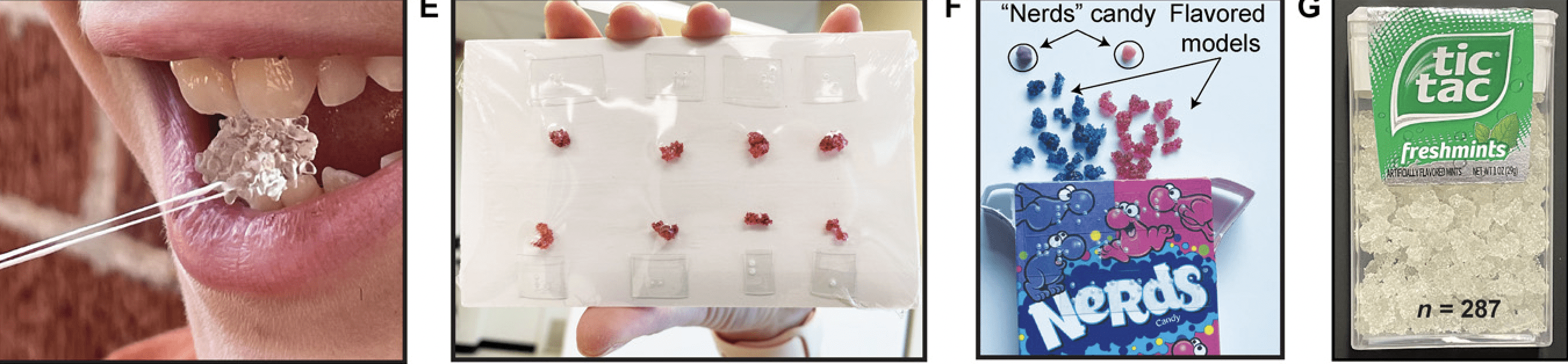 Fig. 1 “Small” and “smaller” molecular models: Highly portable and encodable with flavor. (A) Smaller nonedible 3D-printed models of calmodulin (CaM) and carbonic anhydrase II (CA II) are comparable in size to a popcorn kernel or grain of rice. Array of protein models fabricated and tested in this study from (B) biocompatible resin (top: small size; bottom: smaller size) or (C) gelatin (flavor-coded or uncoded). (D) Small nonedible model with a safety lanyard threaded through the integral eyelet. (E to G) Smaller nonedible models can be coded with flavor and transported in high volume. (E) Shrink-wrapped array onto a standard index card and (F and G) packed into common containers of candy (shown for demonstration purposes). Photo credit: Jordan C. Koone, Baylor University; Bryan F. Shaw, Baylor University; and Elizabeth Shaw.