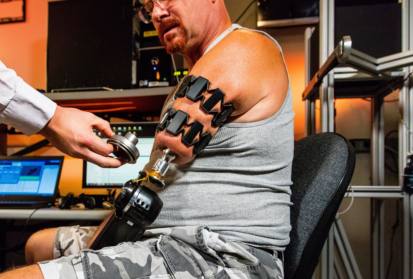 Johnny Matheny, who lost one of his arms to cancer, is the subject of this research. He wears two Myo armbands that monitor his muscle activity on his upper arm when he thinks of moving his arm in different ways (twist, grip, open, close, etc.), converts them into signals, transmits them to a computer nearby which in turn sends them to the prosthetic arm to perform the desired action. In the future, it is expected that Johnny may be able to tell how hard or soft an object is, or even the temperature of it.