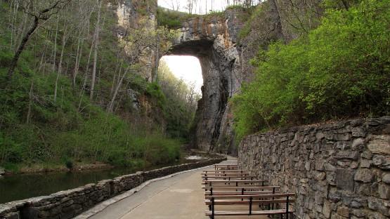 Photo of the iconic Natural Bridge at Natural Bridge State Park. The towering limestone arch, surrounded by dense forest, stands majestically over a serene pathway that follows a small stream. Benches are placed along the walkway, offering visitors a peaceful spot to admire the natural wonder and its tranquil environment. The rugged stone wall along the side adds to the rustic charm of the landscape.