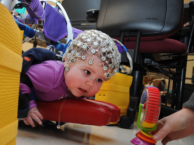 The infant is attached to the robot, whose arms roll on three wheels and has several movement sensors. She also wears the electrodes studded cap which sends brain activity to a computer. Her body movement is tracked by the sensors and sent to the attached computer, and if it is determined that she is trying but is not getting the desired movement, the robot gives her a gentle nudge to keep the body movement going, thus rewarding her attempt. The computer, through it’s machine learning algorithm, directs the robot to assist the infant. For example, if she pushes with her back feet to move ahead but doesn’t generate the necessary force, the robot gently pushes her a few inches ahead to obtain the desired movement.