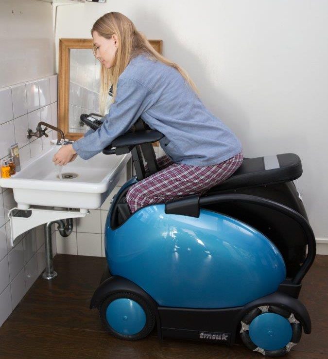 The handles, and seat height can be adjusted to reach the height of others. Rodem also has a chest support that can be adjusted so you could lean forward easily to wash your hands/ face or grab something from the dinner table. The chair can also rotate which enables the user to move in really small spaces. It’s 8 hour rechanrge time ensures movement of up to 9.3 miles at a top speed of 3.7 mph.