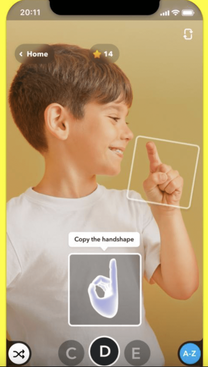 Built in partnership with SignAll, this lens uses Augmented Reality to identify handshapes to fingerspell words. The lens comes with three modes that enable users to learn handshakes, practice fingerspelling, and play games that can help them memorize words.