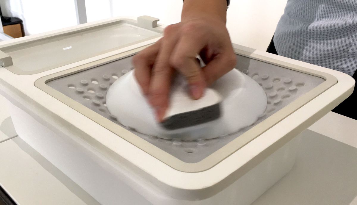 OneWare can be used over a sink or in the kitchen, and comes with attachments for washing dishes and cutting vegetables and fruits. The one for dishes is made of perforated silicon that grips dishes very tightly, and doesn’t budge as the person cleans it with one hand. The other attachment holds vegetables and fruits – it has teeth that can grip the vegetable securely, and a person can chop it very easily with just one hand.