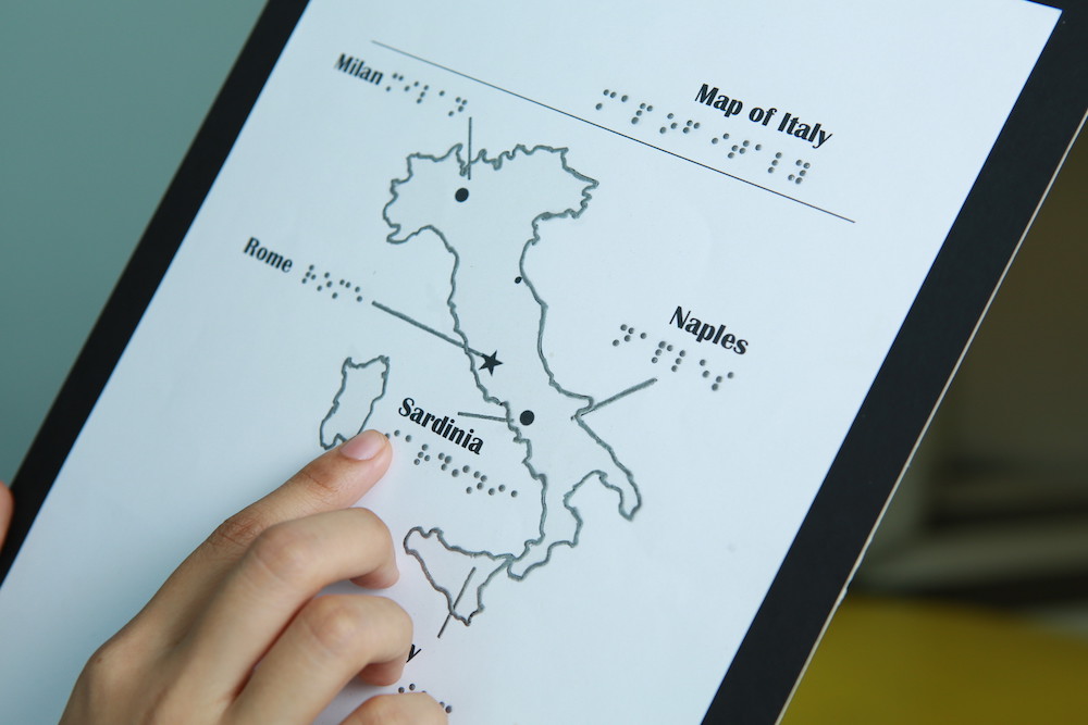 Thailand’s Thammasat University, in collaboration with Samsung, has created a new ink that rises up when heated, thus giving it an embossed effect, just like what you would expect from a Braille embosser. What’s revolutionary about this ink is that it can be used with regular printers on regular paper, thus eliminating the need for expensive Braille embossers that emboss on special Braille paper. What’s more interesting about it is that it would also be able to print non-braille objects as well. For example, a picture of a map could be printed with this ink on regular paper along with locations within the map printed in Braille (as seen in the image above). A combination of raised text and images will open new avenues for consuming text based material for blind people.