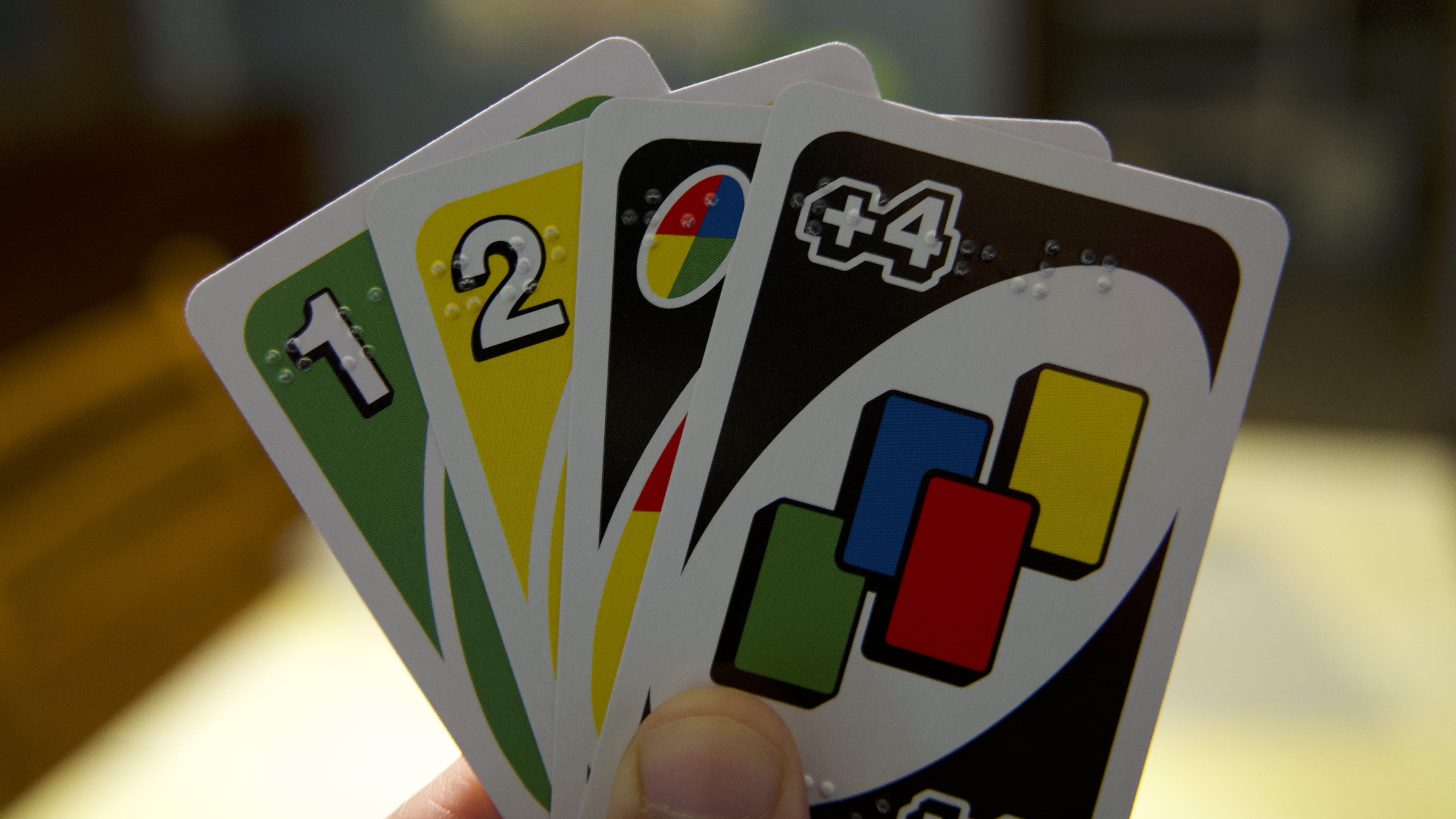 UNO Braille features braille on the corner of every playing card to indicate the card’s number or action and color.