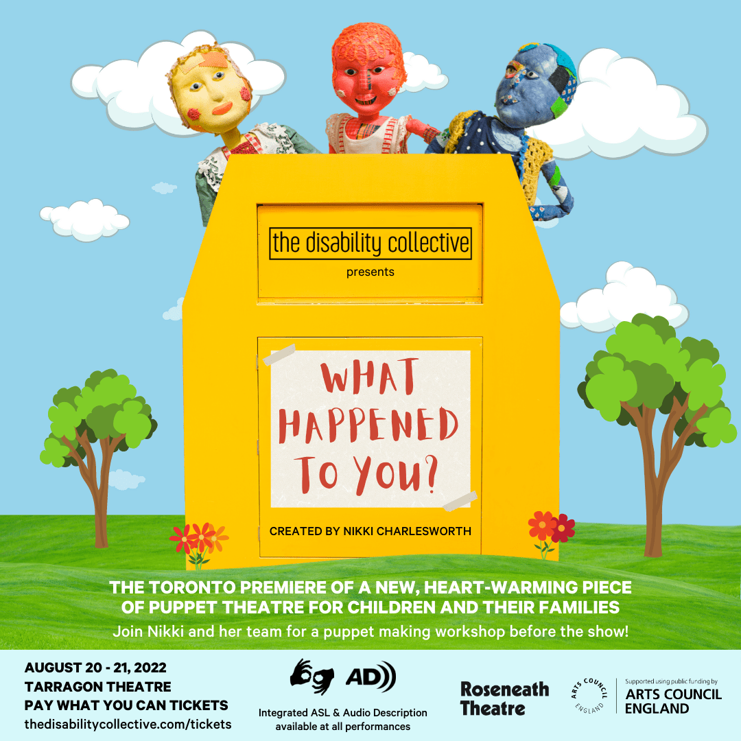 Presented by The Disability Collective, What Happened to You? is produced with support from Arts Council England, Roseneath Theatre, Tarragon Theatre, Navigator, Re•Vision: The Centre for Art and Social Justice, and PrintPop.