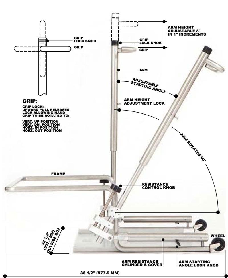 The equipment is mainly made up of a frame, arms, hand grips, and cylinders. The user can perform various upper body exercises by moving/rotating the arms in different angles. There is a resistance control knob that can set 8 levels of resistance. Turning the knob clockwise increases resistance and counter clockwise decreases it.